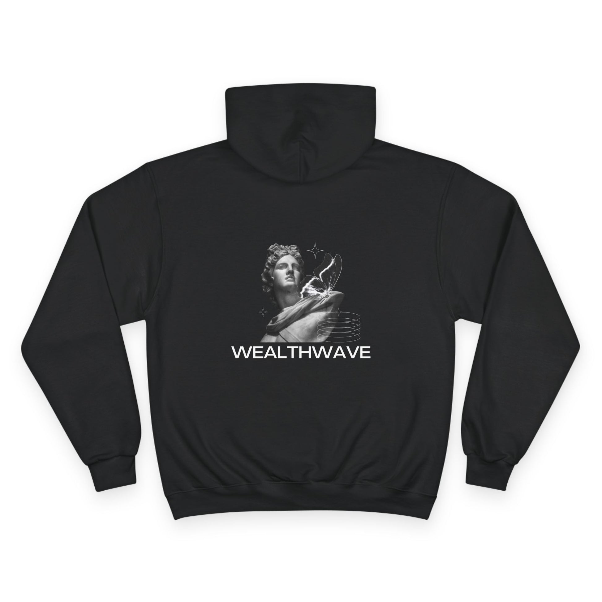 This heavyweight Champion hoodie blends old-world sculpture imagery with clean, modern typography for a quietly bold look. The front keeps things minimal with a small star detail, while the back features a grayscale classical statue and the word WEALTHWAVE — a design that reads like streetwear with a cultured edge. Built from a durable 50/50 cotton-poly blend and a tubular knit, it drapes with relaxed shape and holds prints beautifully. Wear it on cool mornings, at late-night creative sessions, or while wandering city streets — it layers easily, pockets hold your essentials, and the subtle Champion “C” on the sleeve signals quality without shouting. For people who want comfort, structure, and a hint of artful attitude, this hoodie feels lived-in from the first pull-on and only grows better with wear.