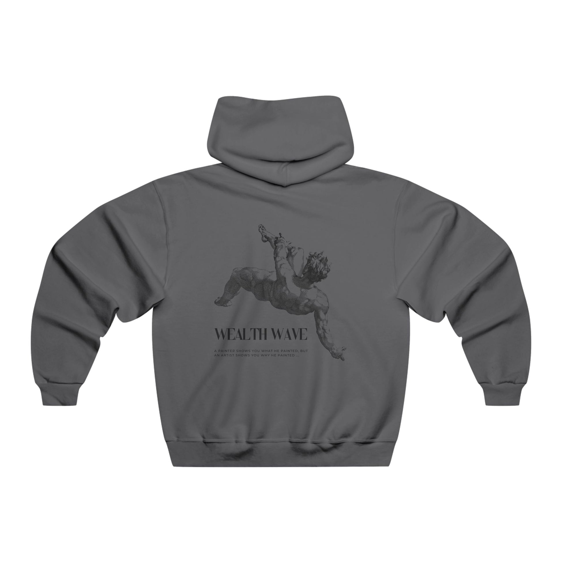 This roomy hooded sweatshirt wears like a quiet statement. The soft heather gray fabric feels substantial without weighing you down — a medium-heavy knit that drapes loose and moves with you. A small, subtle emblem sits near the collarbone while a larger, artful sketch spans the back: a reclining figure and the words “WEALTH WAVE” rendered in muted tones. It reads like a sketchbook turned streetwear piece — thoughtful, slightly rebellious, and comfortably lived-in. The adjustable drawstring hood and deep kangaroo pocket make it easy to layer on cool mornings. Let it be the sweatshirt you reach for when you want to feel grounded, creative, and a little mysterious.